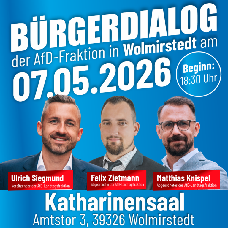 Abgeordnete der AfD-Fraktion im Landtag von Sachsen-Anhalt werden mit Ihnen über das aktuelle politische Geschehen diskutieren und Einblicke in die parlamentarische Arbeit der stärksten Opposition im Landtag geben.