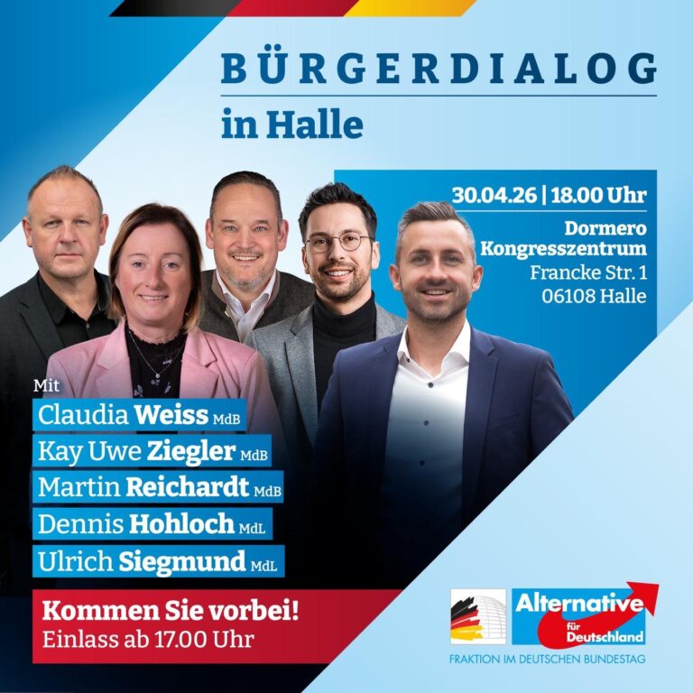 Die MdB-Landesgruppe Sachsen-Anhalt lädt Sie herzlich zum Bürgerdialog am 30. April 2026 in Halle ein. Die Veranstaltung findet im Dormero Kongresstentrum statt, Beginn ist um 18:00 Uhr, der Einlass startet ab 17:00 Uhr.