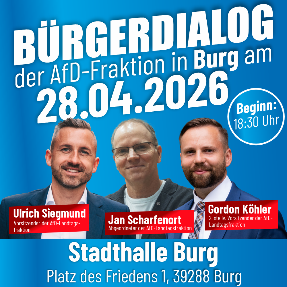 Gibt es Dinge, die Sie unsere Abgeordneten schon immer mal fragen wollten? Am Dienstag, dem 28. April 2026, haben Sie dafür die Gelegenheit! Kommen Sie vorbei und sprechen Sie direkt vor Ort mit uns: Stadthalle Burg, Platz des Friedens 1, 39288 Burg. Einlass ab 18:00 Uhr, Beginn um 18:30 Uhr. Abgeordnete der AfD-Fraktion im Landtag […]