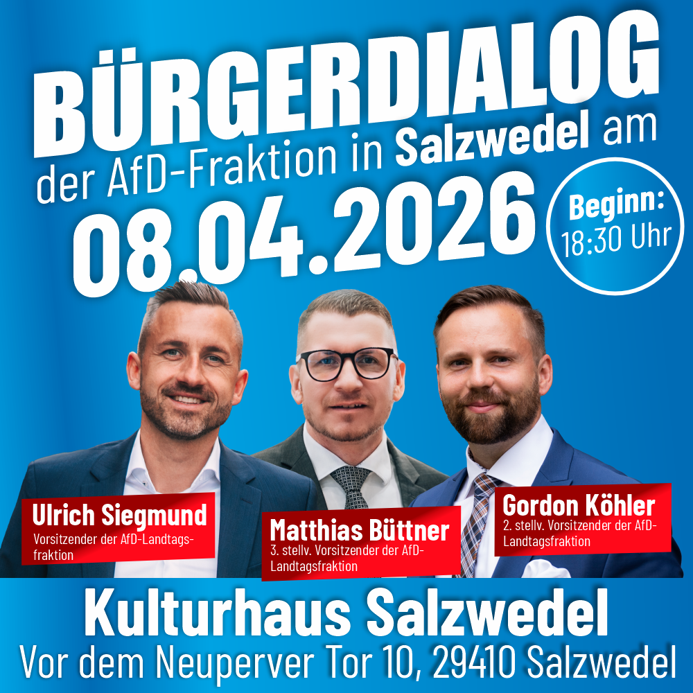 Gibt es Dinge, die Sie unsere Abgeordneten schon immer mal fragen wollten? Am Mittwoch, dem 8. April 2026, haben Sie dafür die Gelegenheit! Kommen Sie vorbei und sprechen Sie direkt vor Ort mit uns: Kulturhaus Salzwedel, Vor dem Neuperver Tor 10, 29410 Salzwedel. Einlass ab 18:00 Uhr, Beginn um 18:30 Uhr. Abgeordnete der AfD-Fraktion im […]