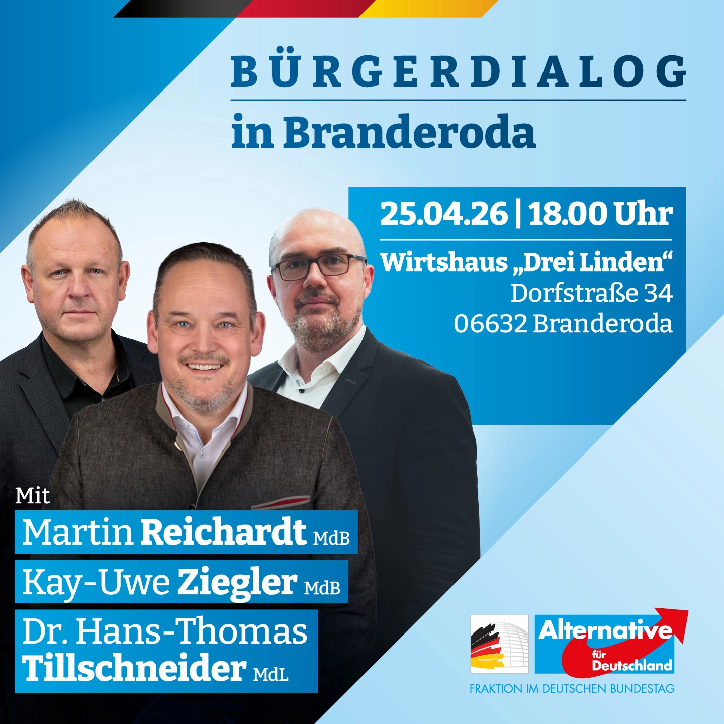 Die MdB-Landesgruppe Sachsen-Anhalt lädt Sie herzlich zum Bürgerdialog am 25.04.2026 in Branderoda ein. Die Veranstaltung findet im Wirtshaus "Drei Linden" Dorfstraße 34, Branderoda, Sachsen-Anhalt 06632 statt, Beginn ist um 18.00 Uhr der Einlass startet ab 17.30 Uhr. Freuen Sie sich auf spannende Beiträge und den direkten Austausch mit den Rednern Martin Reichardt (MdB), Kay Uwe […]