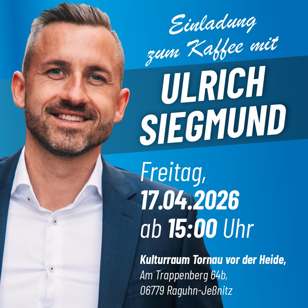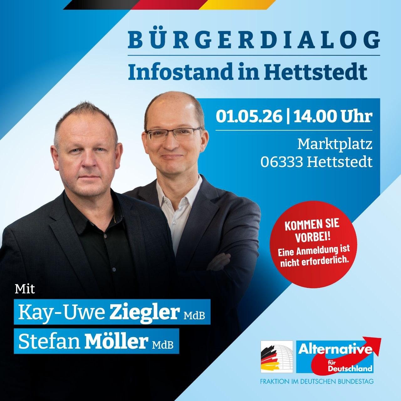 Die MdB-Landesgruppe Sachsen-Anhalt lädt Sie herzlich zum Bürgerdialog-Infostand am 01.05.2026 in Hettstedt ein. Die Veranstaltung findet auf dem Marktplatz statt, Beginn ist um 14.00 Uhr. Freuen Sie sich auf spannende Beiträge und den direkten Austausch mit unserem Bundestagsabgeordneten Kay-Uwe Ziegler sowie Stefan Möller aus Thüringen Im Rahmen der Veranstaltung erhalten Sie aktuelle Berichte aus Berlin […]
