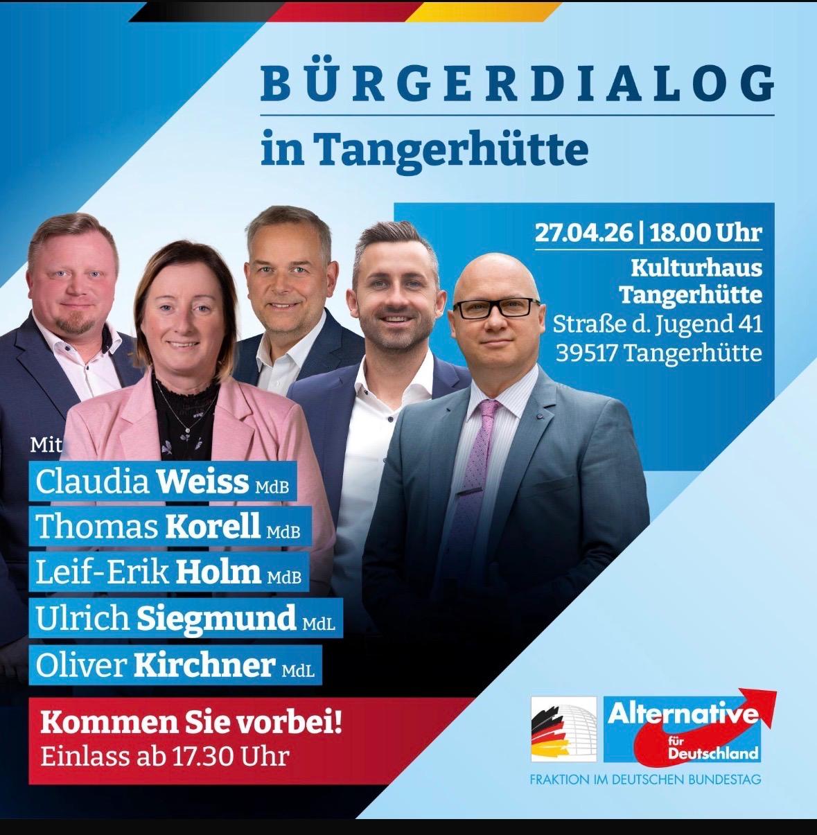 Die MdB-Landesgruppe Sachsen-Anhalt lädt Sie herzlich zum Bürgerdialog am 27. April 2026 in Tangerhütte ein. Die Veranstaltung findet im Kulturhaus statt, Beginn ist um 18:00 Uhr, der Einlass startet ab 17:30 Uhr. Freuen Sie sich auf spannende Beiträge und den direkten Austausch mit den Rednern Claudia Weiss (MdB), Thomas Korell (MdB), Leif-Erik Holm (MdB), Ulrich […]