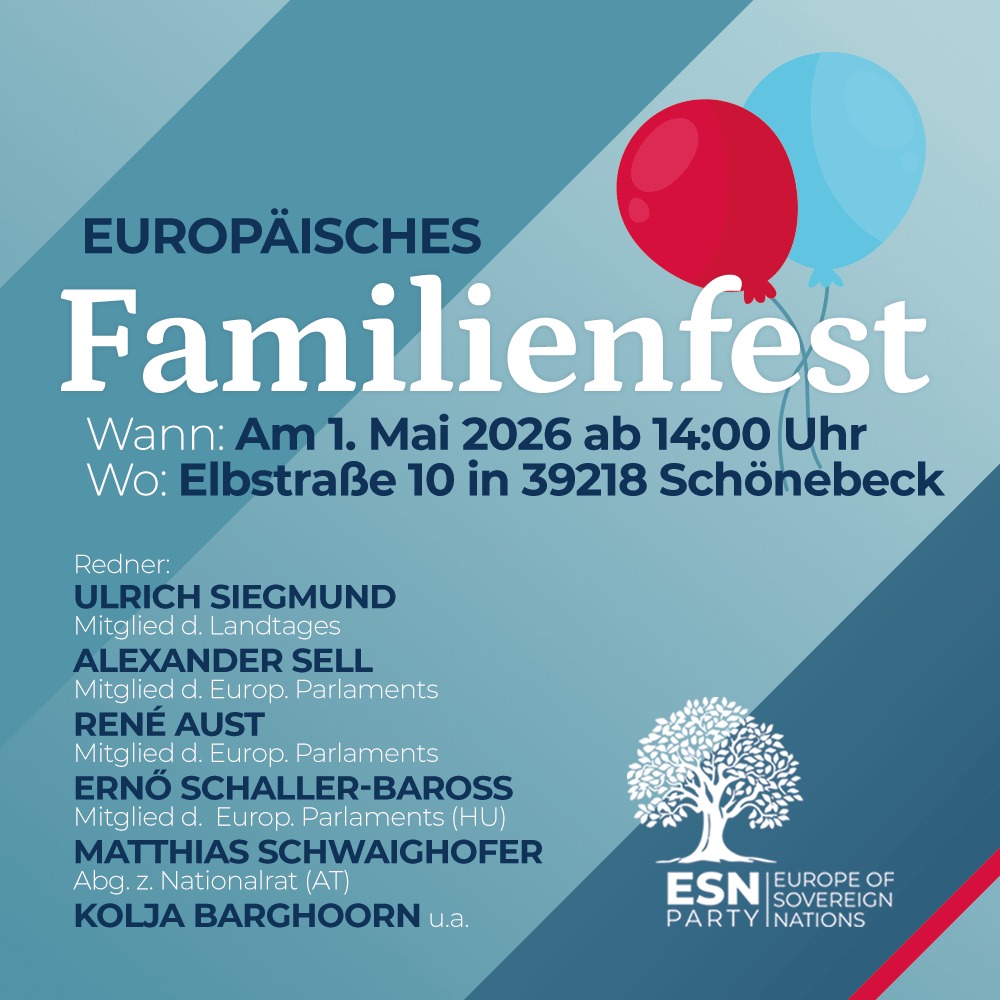 Am kommenden 1. Mai 2026 laden wir herzlich zum europäischen Familienfest der ESN-Partei in Schönebeck an der Salzblume ein. Von 14:00 bis 19:00 Uhr erwartet euch ein buntes Programm für Jung und Alt. Wann: 1. Mai 2026, ab 14:00 Uhr Wo: Salzblume, Elbstraße 10, 39218 Schönebeck (Elbe) Parkmöglichkeit: Am Braunen Hirsch, Salzstraße 6, 39218 Schönebeck […]